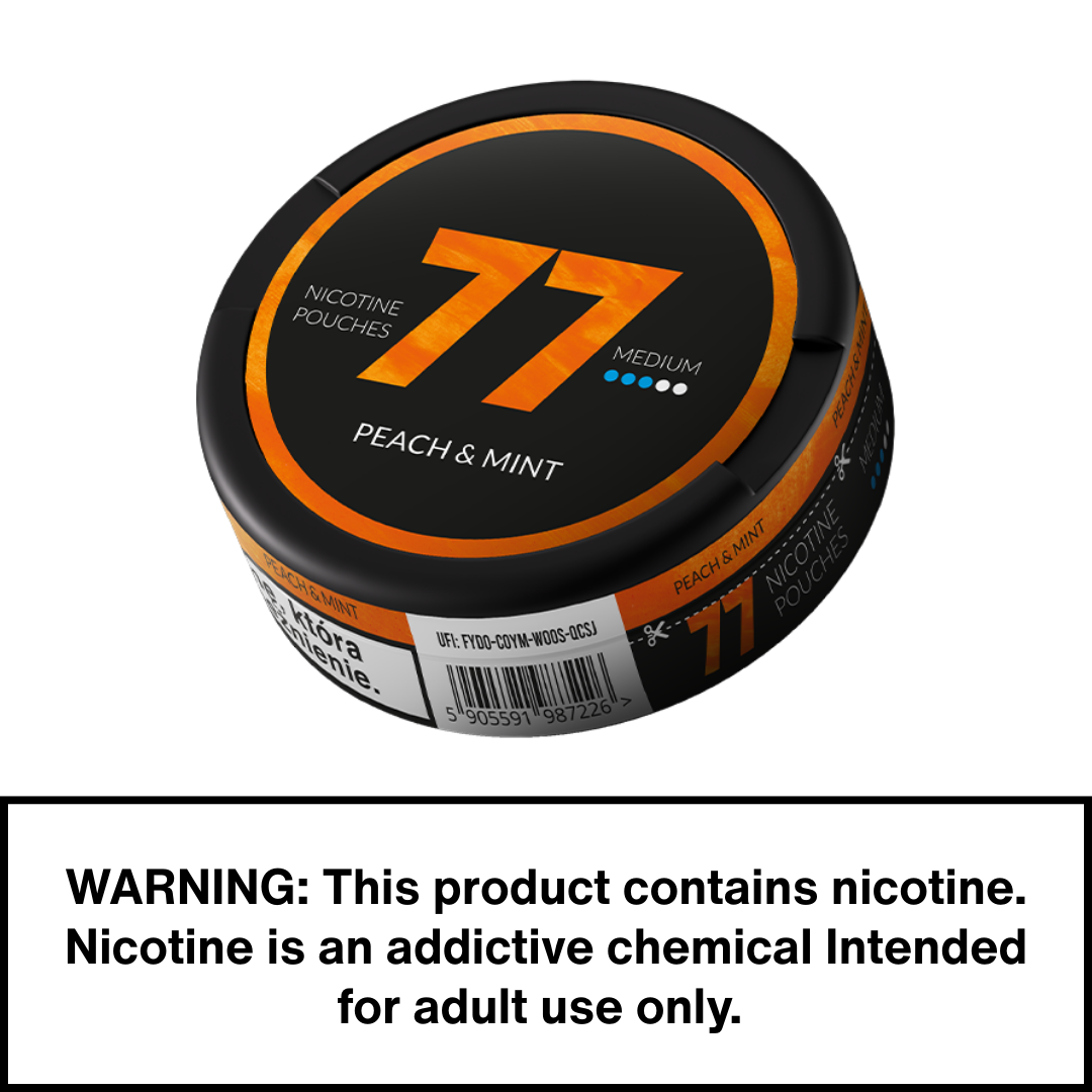 Meet the 77 Peach & Mint nicotine pouches in a medium version. This is a convenient and very modern way to deliver nicotine to your body, without smoke or unpleasant odour or tobacco.