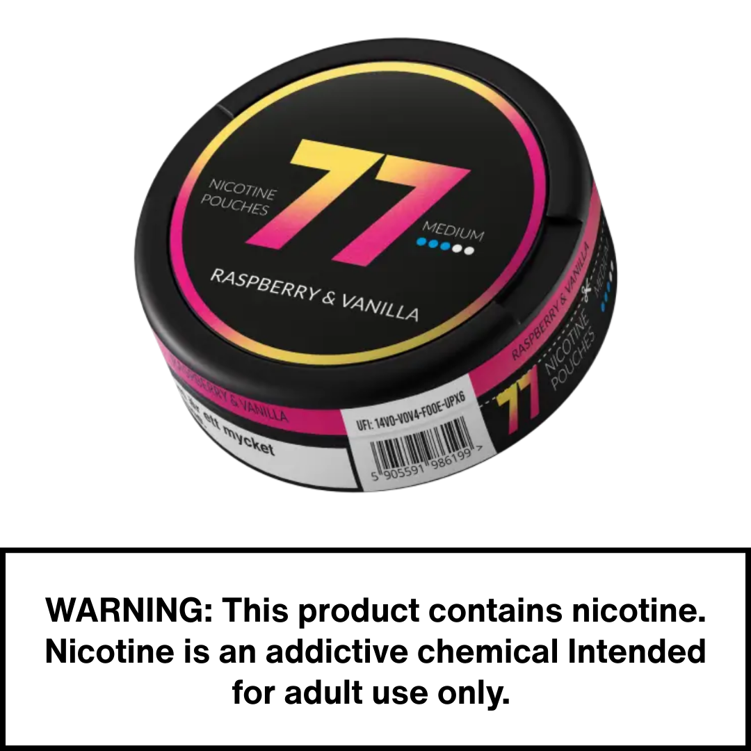 Meet the 77 Raspberry & Vanilla nicotine pouches in a medium version. This is a convenient and very modern way to deliver nicotine to your body, without smoke, unpleasant smell or tobacco.